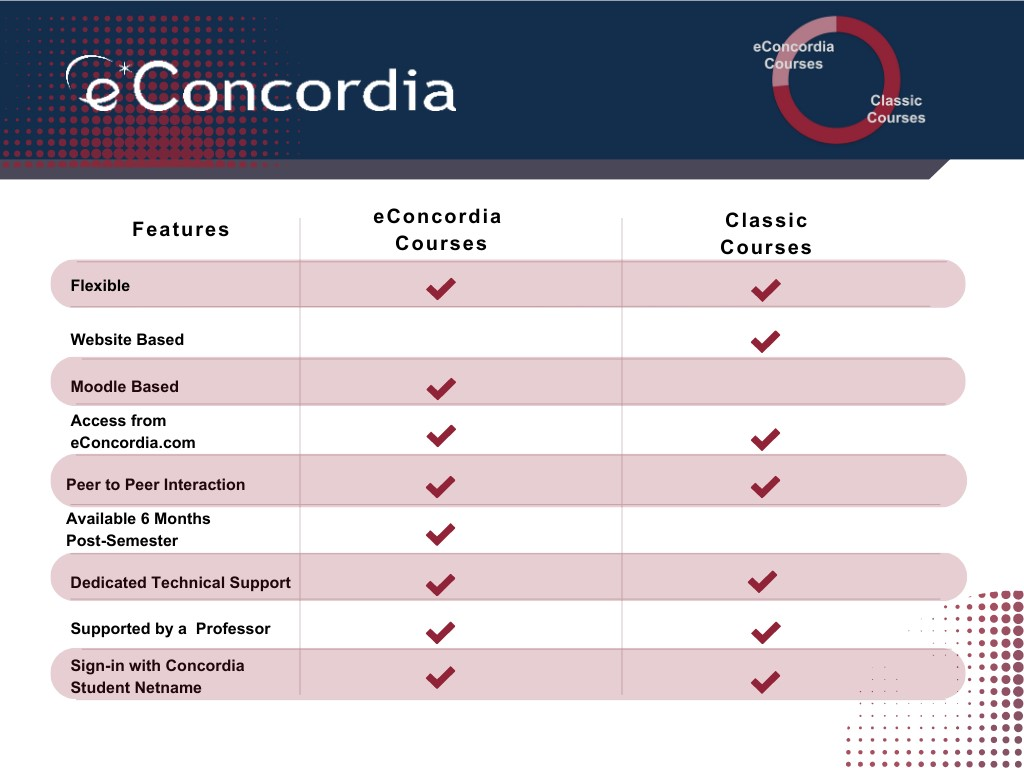 eConcordia courses are hosted on two state-of-the art platforms. Our Classic platform and our eConcordia platform. Our Classic Platform is website based and has a more traditional feel. Our eConcordia platform is Moodle based and has a more modern feel. Below you can see the features of each platform.