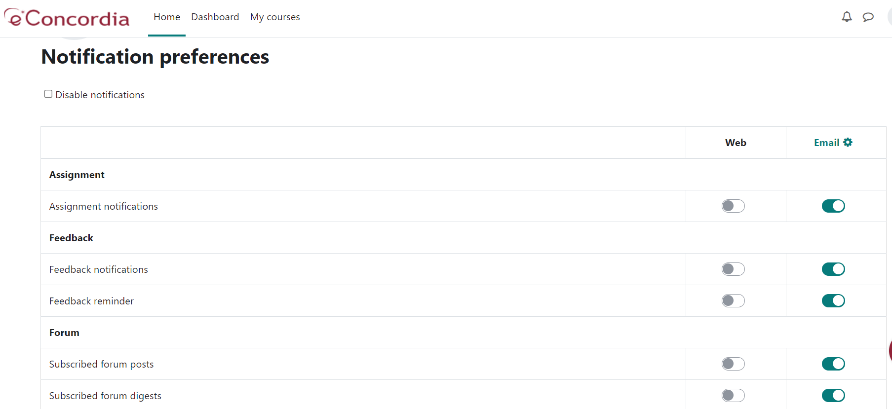 Your Notification preferences page can be accessed and updated by selecting the user menu at the top right of the eConcordia page and then selecting “Preferences” and "Notification preferences" link. You can change your notifications settings using the toggle button for each option.